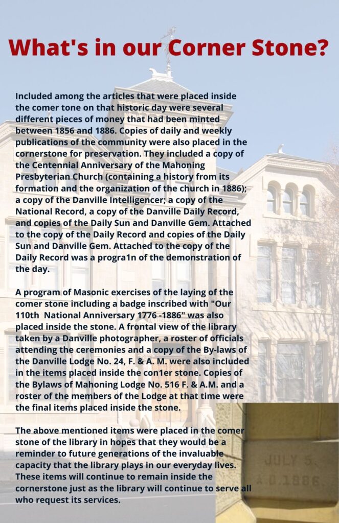 Before the library was built, in 1886, the Reverend of Mahoning Presbyterian Church wanted to add a section to the church as reading rooms for the young men of Danville. But when Thomas Beaver got his hands on the idea, he decided creating an entire library, funded by him, would be more beneficial for the young men. During the cornerstone ceremony, his nephew, James A. Beaver, thought the library wasn’t enough. So the YMCA was added to the project as a recreation center.